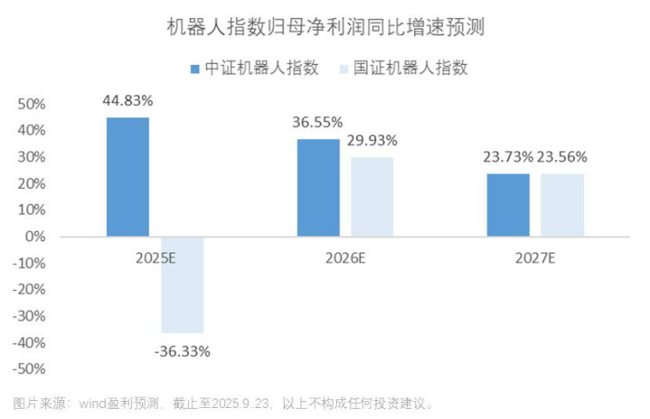 3)盈利预期光芒四射。2025年上半年,中证机器人指数前十大成分股中有7只实现营收同比增长、6只实现归母净利润同比增长,其中前两大权重股汇川技术/科大讯飞归母净利润分别增长40.15%/40.37%。根据wind预测,中证机器人指数2025年归母净利润同比增速达44.83%,遥遥领先国证机器人指数的-36.33%,且2026年的归母净利润同比增速也超过国证机器人指数。盈利能力更加优质、更加具有确定性,有望在行业的高景气周期迎来“戴维斯双击”。